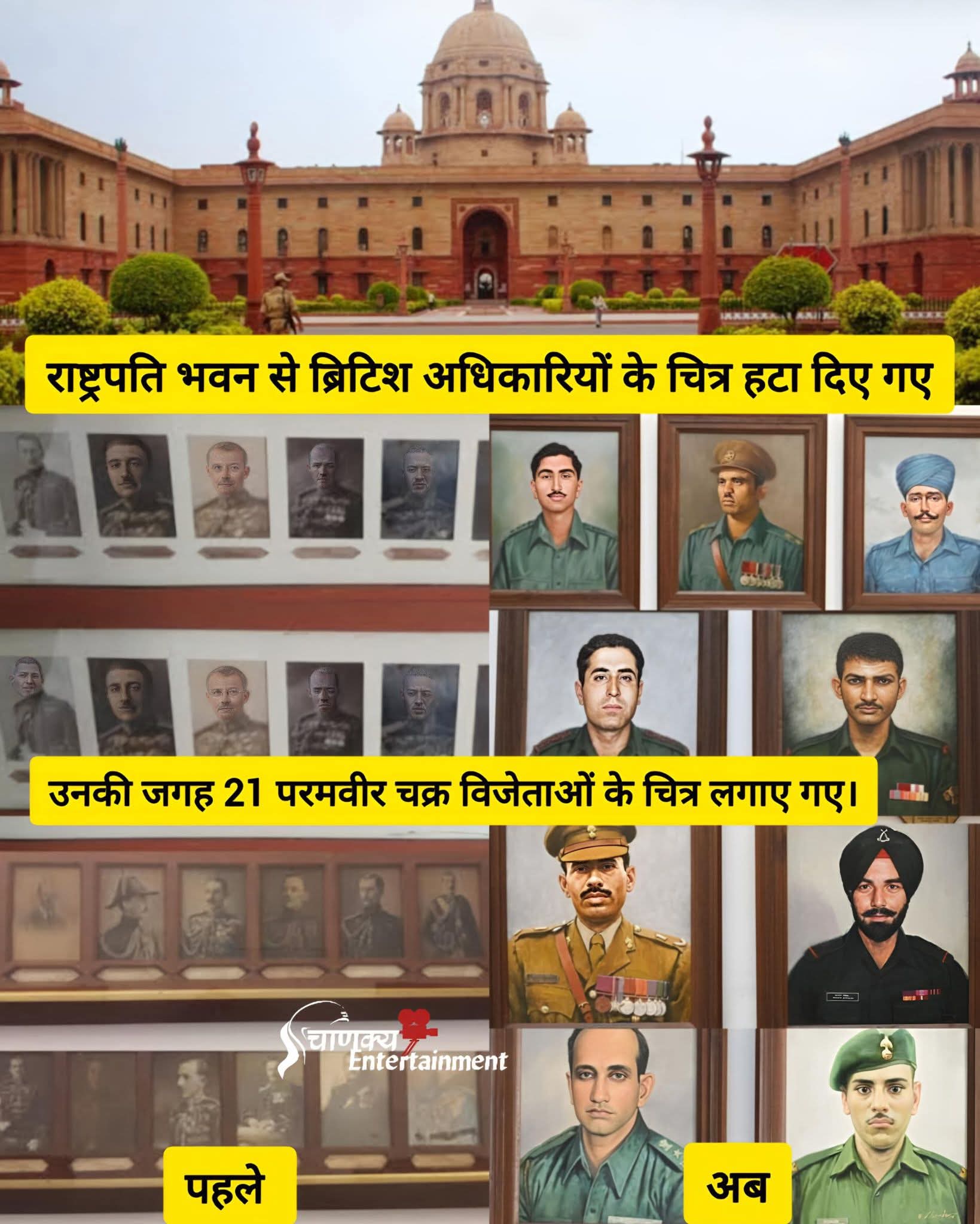 राष्टराष्ट्रपति भवन की दीवारो से अंग्रेजी शासन के अंग्रेज शासकों की तस्वीरों को हटा कर भारत के वीर योद्धाओं सपूतों की तस्वीरों से सुसज्जित कर राष्ट्रपति भवन को सही मैंने में गौरव प्रदान कर भारतीय वीरों को सम्मान दिया गया।जिन्होंने भारत को आजादी दिलाने महत्व्पूर्ण भूमिका निभाई और शहीद हुए।