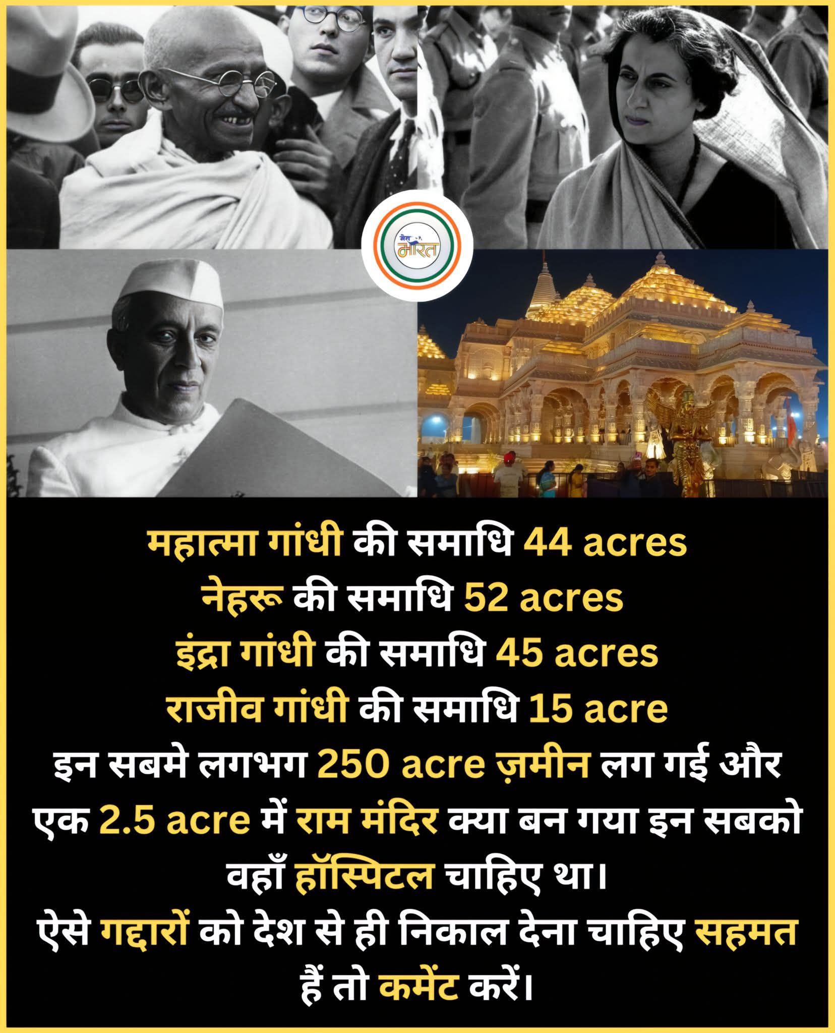 राम मंदिर के 2.5 एकड़ पर ज्ञान देने वालों से असली सवाल ये है कि महात्मा गांधी की राजघाट वाली समाधि लगभग 44 एकड़, नेहरू की शांतिवन करीब 52.6 एकड़, इंदिरा गांधी की शक्ति स्थल 45 एकड़ और राजीव गांधी की समाधि 15 एकड़ पर फैली है – यानी कुल मिलाकर 100 से भी ज़्यादा एकड़ ज़मीन सिर्फ वीवीआईपी समाधियों के नाम पर घिरी बैठी है।🪦