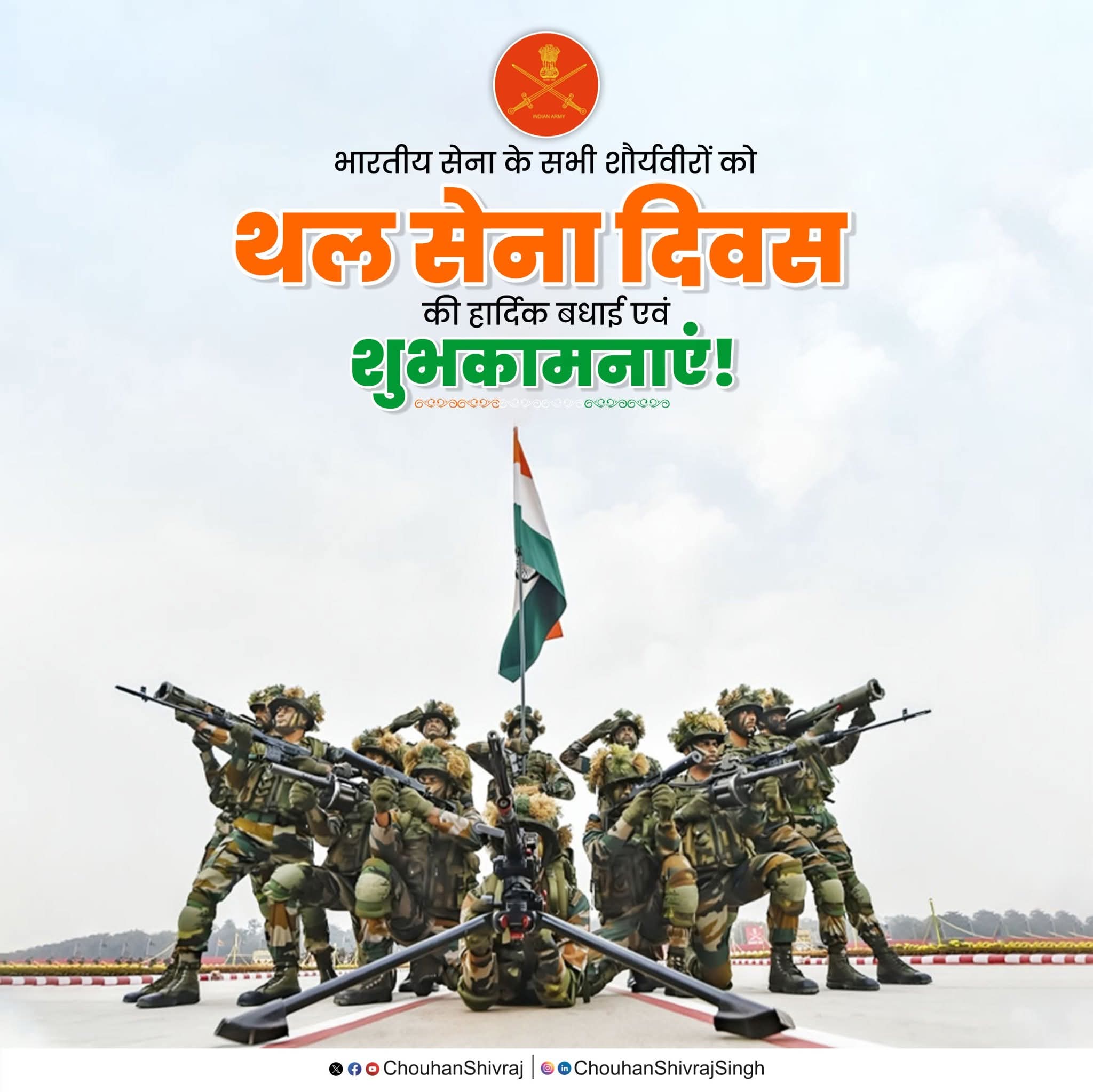 अद्वितीय शौर्य, साहस, पराक्रम एवं अनुशासन की परिचायक, माँ भारती की सेवा, सम्मान और गौरव की रक्षा में सतत रत हमारे पराक्रमी सैनिकों को ‘थल सेना दिवस’ की हार्दिक बधाई एवं शुभकामनाएं!