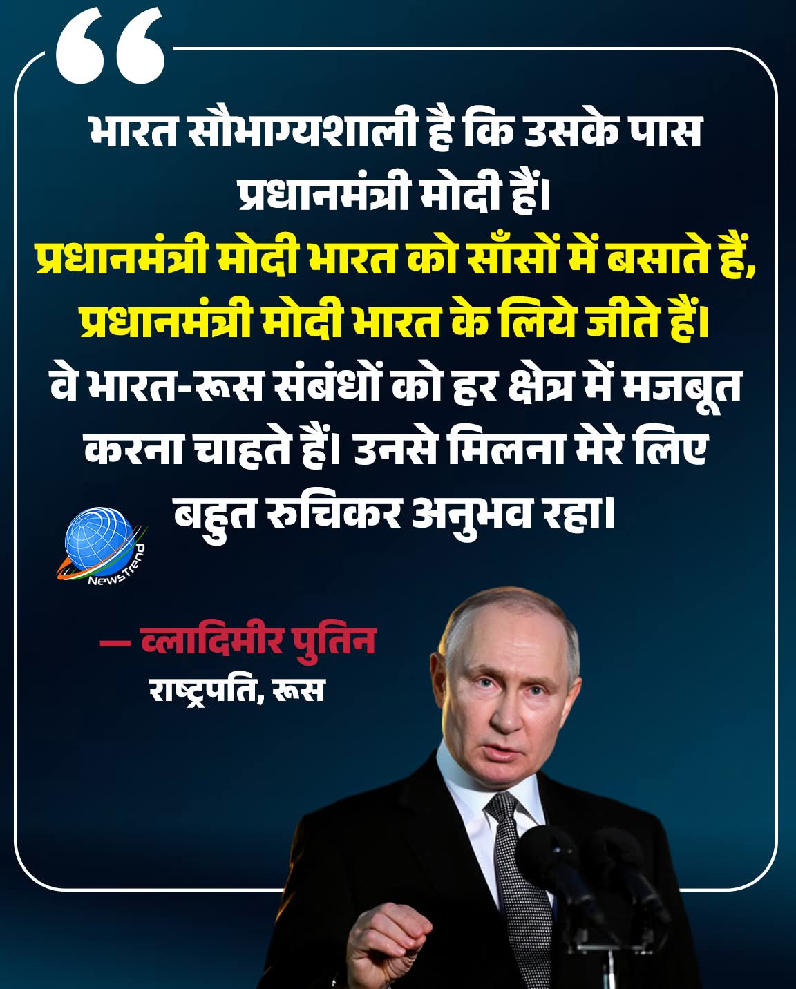 रूस के राष्ट्रपति व्लादिमीर पुतिन नेप्रधानमंत्री नरेंद्र मोदी की खुलकर सराहना की है।पुतिन ने कहा—“भारत सौभाग्यशाली है कि उसके पास प्रधानमंत्री मोदी हैं।प्रधानमंत्री मोदी भारत को साँसों में बसाते हैं,प्रधानमंत्री मोदी भारत के लिये जीते हैं।वे भारत–रूस संबंधों कोहर क्षेत्र में मजबूत करना चाहते हैं।उनसे मिलना मेरे लिएबहुत रुचिकर अनुभव रहा।”पुतिन के इस बयान कोभारत–रूस की गहरी होती दोस्ती कामज़बूत संकेत माना जा रहा है। #Putin #NarendraModi #IndiaRussia #GlobalDiplomacy #WorldPolitics #StrategicPartnership #InternationalRelations #TrendingNews