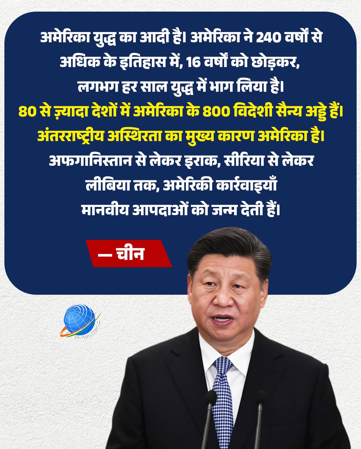 चीन ने अमेरिका की विदेश नीति और सैन्य दखल परकड़ा बयान जारी किया है।चीन ने कहा—“अमेरिका युद्ध का आदी है।240 वर्षों से अधिक के इतिहास में,सिर्फ 16 साल छोड़कर,लगभग हर साल अमेरिका युद्ध में शामिल रहा है।80 से ज़्यादा देशों मेंअमेरिका के करीब 800 विदेशी सैन्य अड्डे हैं।अंतरराष्ट्रीय अस्थिरता कामुख्य कारण अमेरिका है।अफगानिस्तान से लेकर इराक,सीरिया से लेकर लीबिया तक—अमेरिकी कार्रवाइयों नेमानवीय आपदाओं को जन्म दिया है।” #China #USA #GlobalPolitics #War #InternationalRelations #Geopolitics #WorldNews #TrendingNews