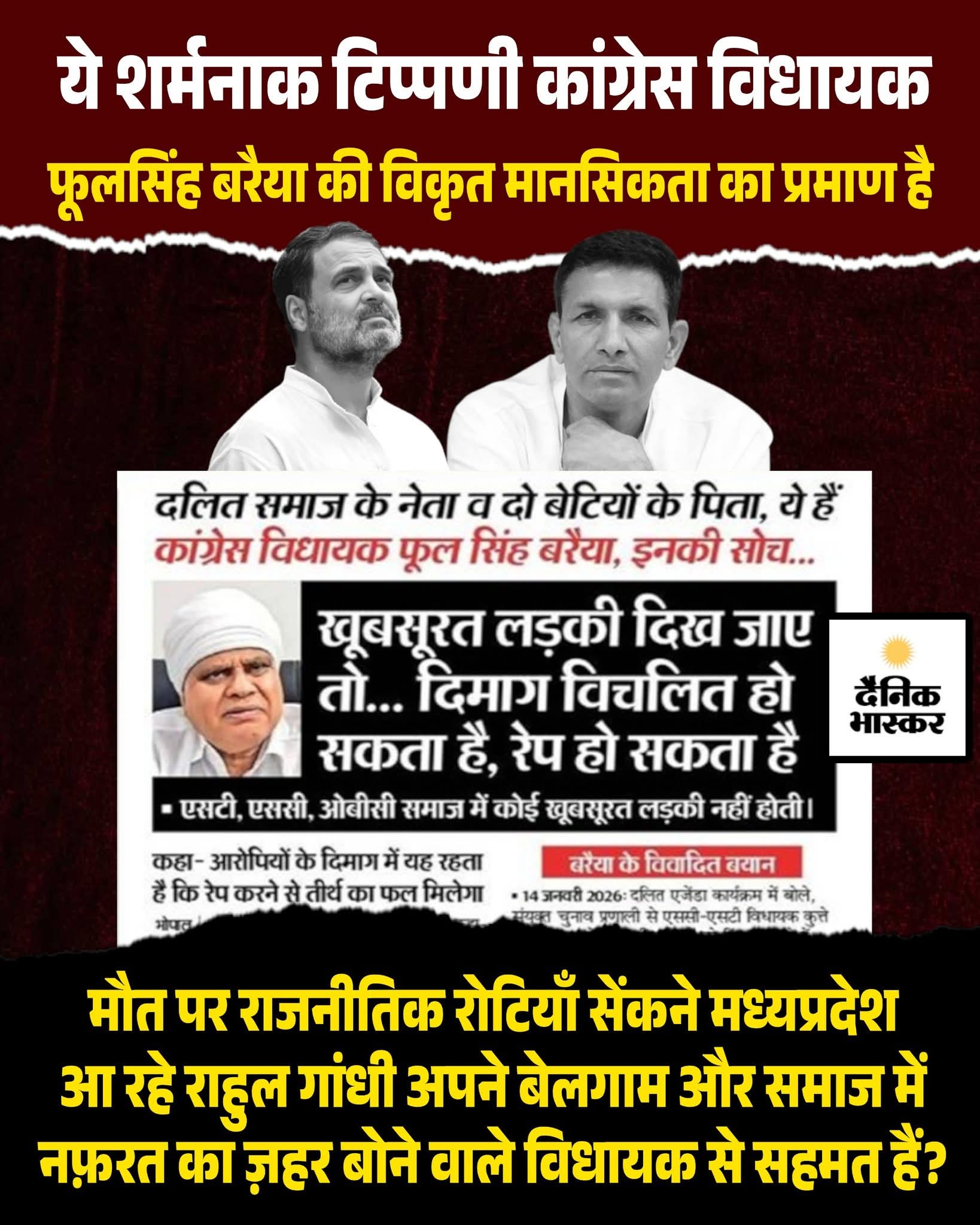 Uncategorized खूबसूरत लड़की दुख जाए तो दिल विचलित हो सकता।रेप हो सकता। admin January 17, 2026 Spread the love ये शर्मनाक टिप्पणी कांग्रेस विधायक फूलसिंह बरैया की विकृत मानसिकता का प्रमाण है। मौत पर राजनीतिक रोटियाँ सेंकने मध्यप्रदेश आ रहे राहुल गांधी अपने बेलगाम और समाज में नफ़रत का ज़हर बोने वाले विधायक से सहमत हैं? About the Author admin Administrator Visit Website View All Posts Post Views: 39 Post navigation Previous: Big Win for the Environment!Next: Laika की कहानी आज भी दिल को भारी कर देती है।वो कोई वैज्ञानिक नहीं थी,कोई सैनिक नहीं थी,वो बस एक आवारा कुतिया थी। जिसने इंसानों पर भरोसा किया।……..क्या उसे अंतरिक्ष में भेजा जाना जरूरी था। Leave a Reply Cancel replyYour email address will not be published. Required fields are marked *Comment * Name * Email * Website Save my name, email, and website in this browser for the next time I comment. Related Stories 1 minute read Uncategorized Another Milestone in India-U.S. Relations! admin February 22, 2026 0 1 minute read Uncategorized India is honoured to welcome President Lula and his delegation, admin February 22, 2026 0 1 minute read Uncategorized At the sidelines of the India AI Impact Summit 2026, Prime Minister Narendra Modi held a meeting with H.S.H Hereditary Prince Alois of Liechtenstein. admin February 22, 2026 0