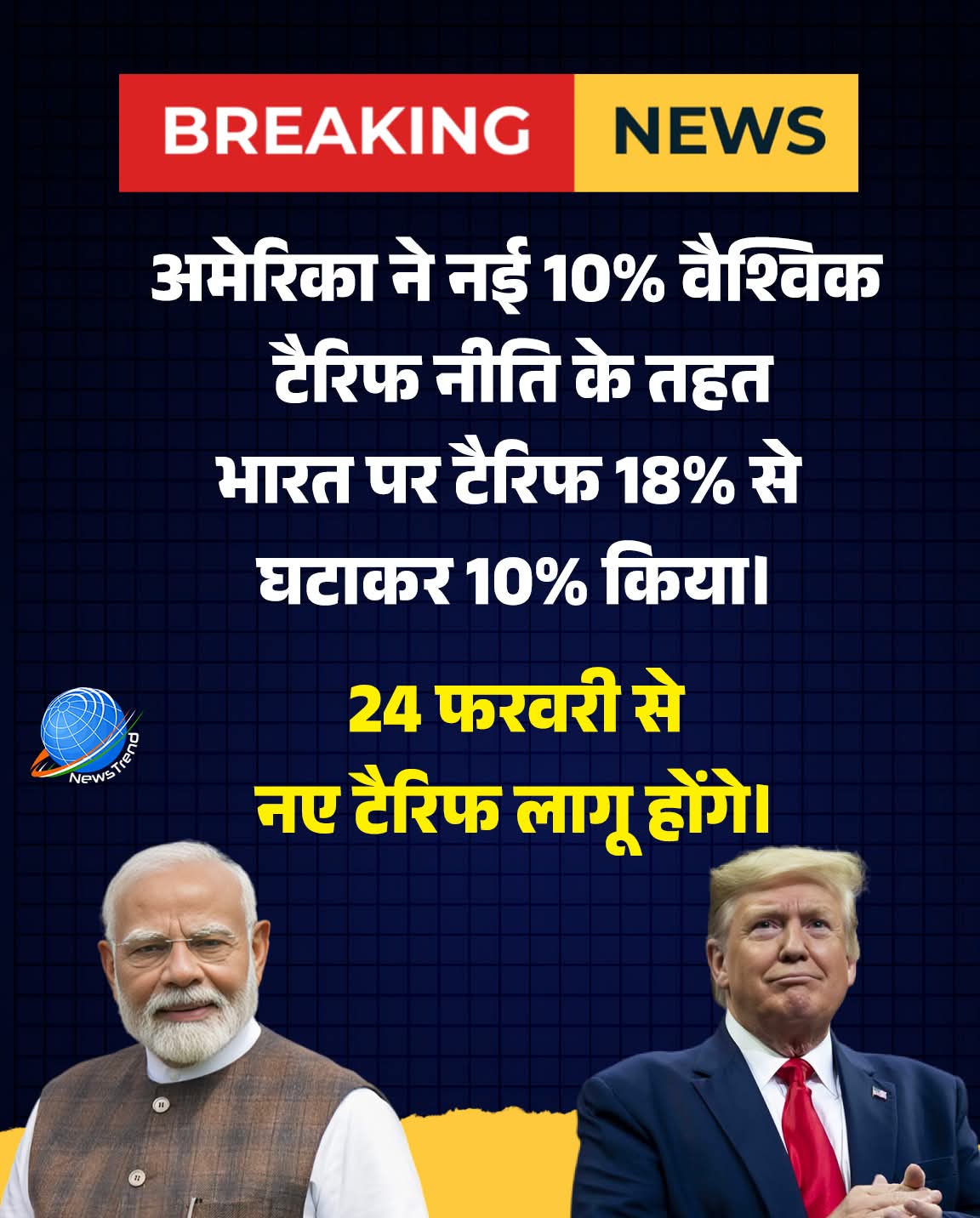 अमेरिकी राष्ट्रपति Donald Trump ने वैश्विक व्यापार को प्रभावित करने वाला बड़ा फैसला लेते हुए अमेरिका में आयातित वस्तुओं पर नया अस्थायी शुल्क लागू करने की घोषणा की है।📉 भारत के लिए टैरिफ में कमीनए फैसले के तहत भारत को अब 18% की जगह सिर्फ 10% टैरिफ दर का सामना करना पड़ेगा।यानी भारतीय निर्यातकों के लिए यह एक महत्वपूर्ण राहत मानी जा रही है। क्या है नया फैसला?ट्रम्प ने घोषणा की कि▪ 24 फरवरी से▪ 150 दिनों की अवधि के लिए▪ अमेरिका में आयातित वस्तुओं पर 10% मूल्य-आधारित अस्थायी आयात अधिभार लगाया जाएगा।उन्होंने कहा — “कुछ भी नहीं बदलता।”इशारा साफ है कि अमेरिका अपनी व्यापार नीति में सख्ती बनाए रखना चाहता है।⚖️ सुप्रीम कोर्ट फैसले के बाद कदमयह घोषणा अमेरिकी सुप्रीम कोर्ट द्वारा व्यापक टैरिफ नीति पर आए फैसले के बाद की गई है, जिसके बाद प्रशासन ने नई वैश्विक शुल्क व्यवस्था लागू की। विशेषज्ञों के मुताबिक कम टैरिफ दर से▪ भारतीय निर्यात प्रतिस्पर्धी रह सकते हैं▪ व्यापारिक दबाव कम हो सकता है▪ द्विपक्षीय व्यापार संबंधों को स्थिरता मिल सकती हैवैश्विक व्यापार युद्ध के बीच भारत को मिली यह राहत आगे क्या नया मोड़ लाएगी, नजरें अब उसी पर हैं।#DonaldTrump #USTariffs #IndiaUSRelations #GlobalTrade #TradePolicy #EconomicNews #IndiaExports