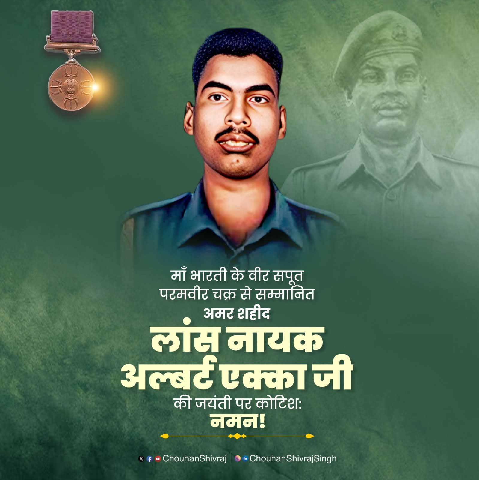 1971 के भारत-पाकिस्तान युद्ध में अप्रतिम शौर्य और पराक्रम का प्रदर्शन करने वाले माँ भारती के वीर सपूत, परमवीर चक्र से सम्मानित, अमर शहीद लांस नायक अल्बर्ट एक्का जी की जयंती पर कोटिश: नमन करता हूँ!