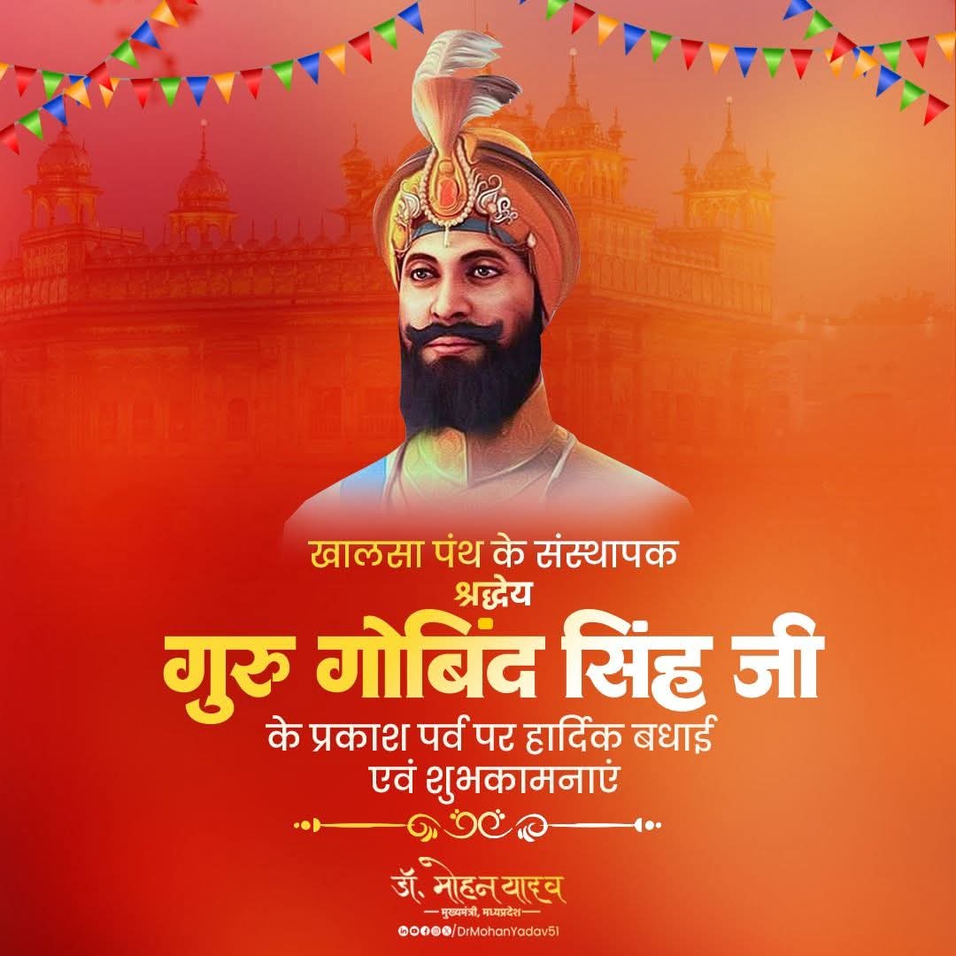 सिख धर्म के दशम गुरु एवं खालसा पंथ के संस्थापक श्री गुरु गोबिंद सिंह जी के प्रकाश पर्व पर हार्दिक बधाई एवं शुभकामनाएं।गुरु जी द्वारा धर्म, मानवता एवं समानता की दी गई शिक्षा और आदर्श जीवन हमें धर्म पथ पर चलने के लिए प्रेरित करते रहेंगे।#GuruGobindSingh