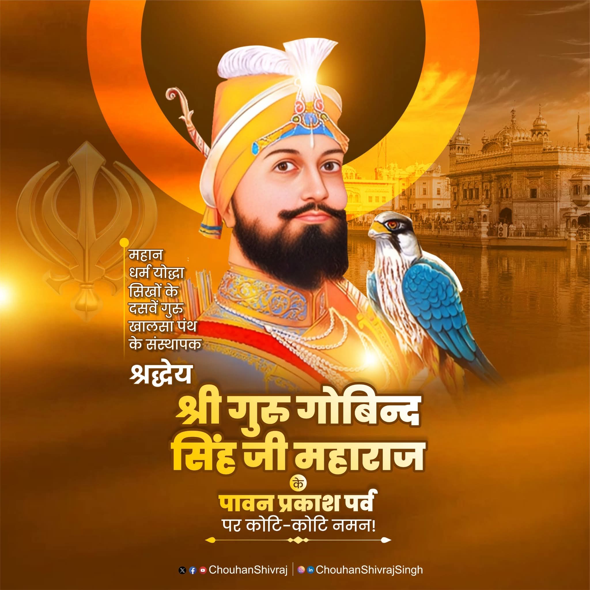 धर्म की रक्षा और मानवता के कल्याण के लिए अपना सर्वस्व न्योछावर कर देने वाले महान धर्म योद्धा, सिखों के दसवें गुरु, खालसा पंथ के संस्थापक, श्रद्धेय श्री गुरु गोबिन्द सिंह जी महाराज के पावन प्रकाश पर्व पर उनके चरणों में कोटि-कोटि नमन करता हूँ!