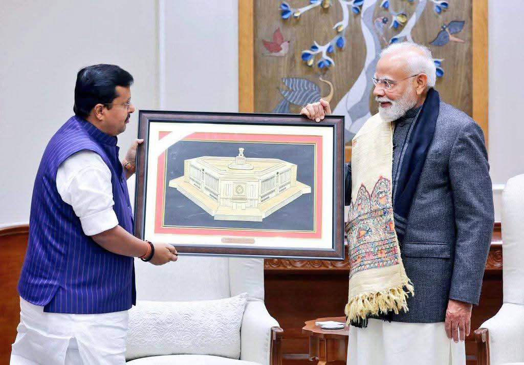 इस अवसर पर आदरणीय प्रधानमंत्री जी को बिहार की समृद्ध सांस्कृतिक विरासत के प्रतीक स्वरूप सिक्की कला से निर्मित पेंटिंग तथा भागलपुरी सिल्क पर मधुबनी आर्ट से सुसज्जित शाल भेंट की।